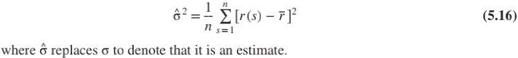 Variance estimate from Equation 5.16 is biased downward, however. As we have taken deviations from sample arithmetic average, instead of unknown, true expected value, E(r), & so have introduced an estimation error. Its effect on estimated variance is aka degrees of freedom bias. We can eliminate bias by multiplying arithmetic average of squared deviations by factor n /(n - 1). Variance & standard deviation become: